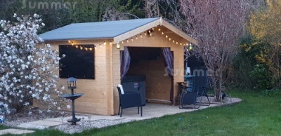 A HOT TUB COVER OR A GAZEBO: This log cabin can be used to cover or enclose a hot tub or spa. Smaller hot tubs will pass through the door opening. Larger hot tubs are positioned before the cabin is installed. There is enough space inside to comfortably accommodate even a large hot tub. This versatile cabin is also popular as a garden gazebo which can be used as a shady retreat in the summer or as a store for garden furniture and toys in winter.